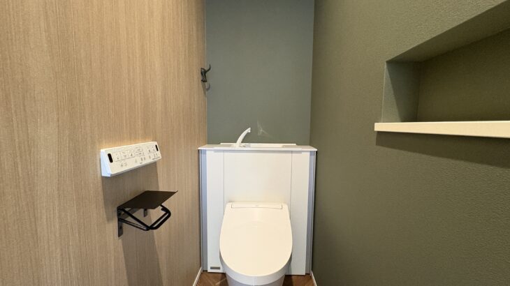 落ち着いた色調でまとめられた、上質感のあるトイレ空間。正面にはすっきりとしたデザ…