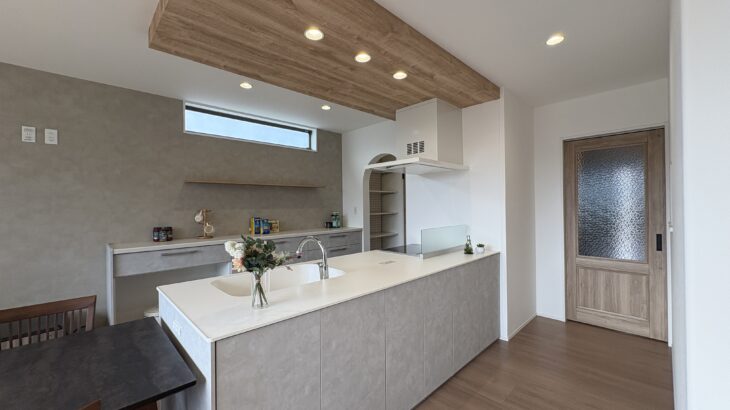 思わず目を引く、木目の下がり天井のあるキッチン。 ダウンライトを組み合わせること…