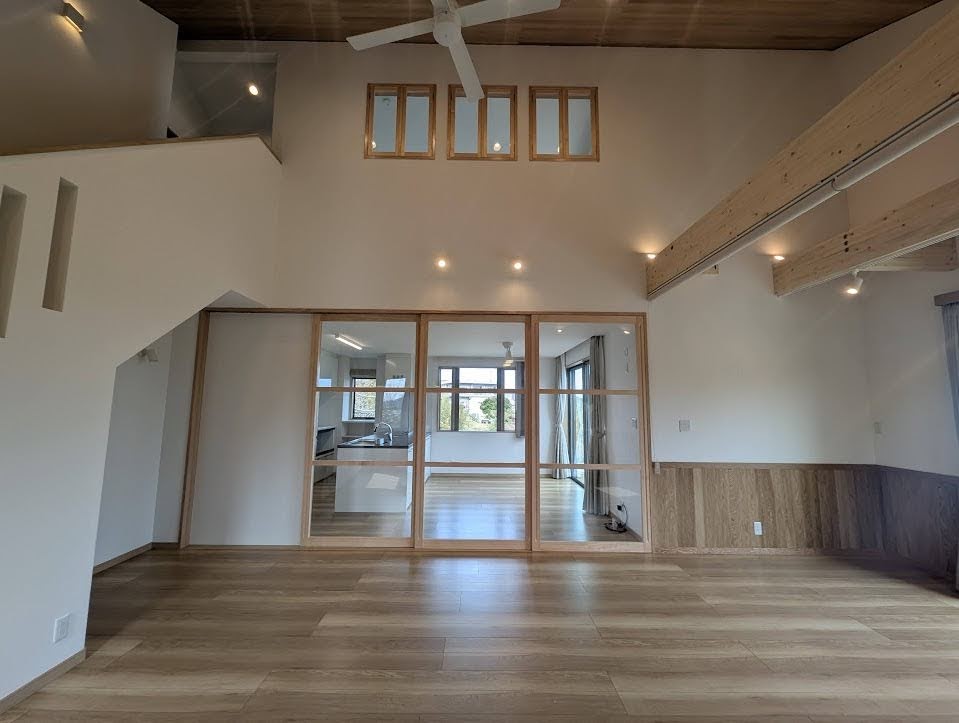 3枚片引きのガラス戸が、音や視線をやさしく仕切りながら、
